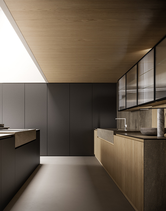 Isole e penisole si inseriscono in spazi ampi e sofisticati, dove i materiali e le linee rigorose creano continuità snodandosi tra i diversi piani d’appoggio e pensili contenitori.
